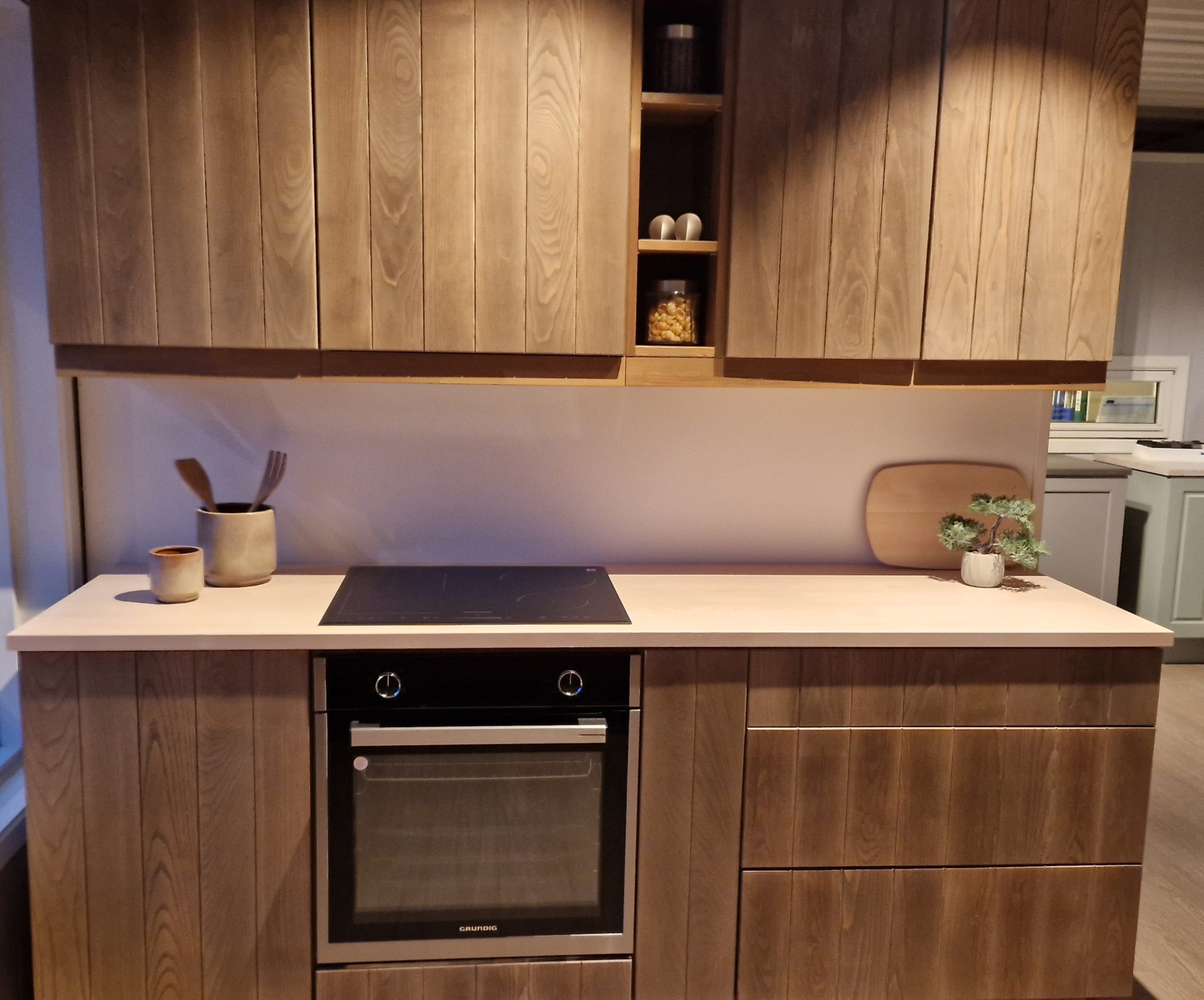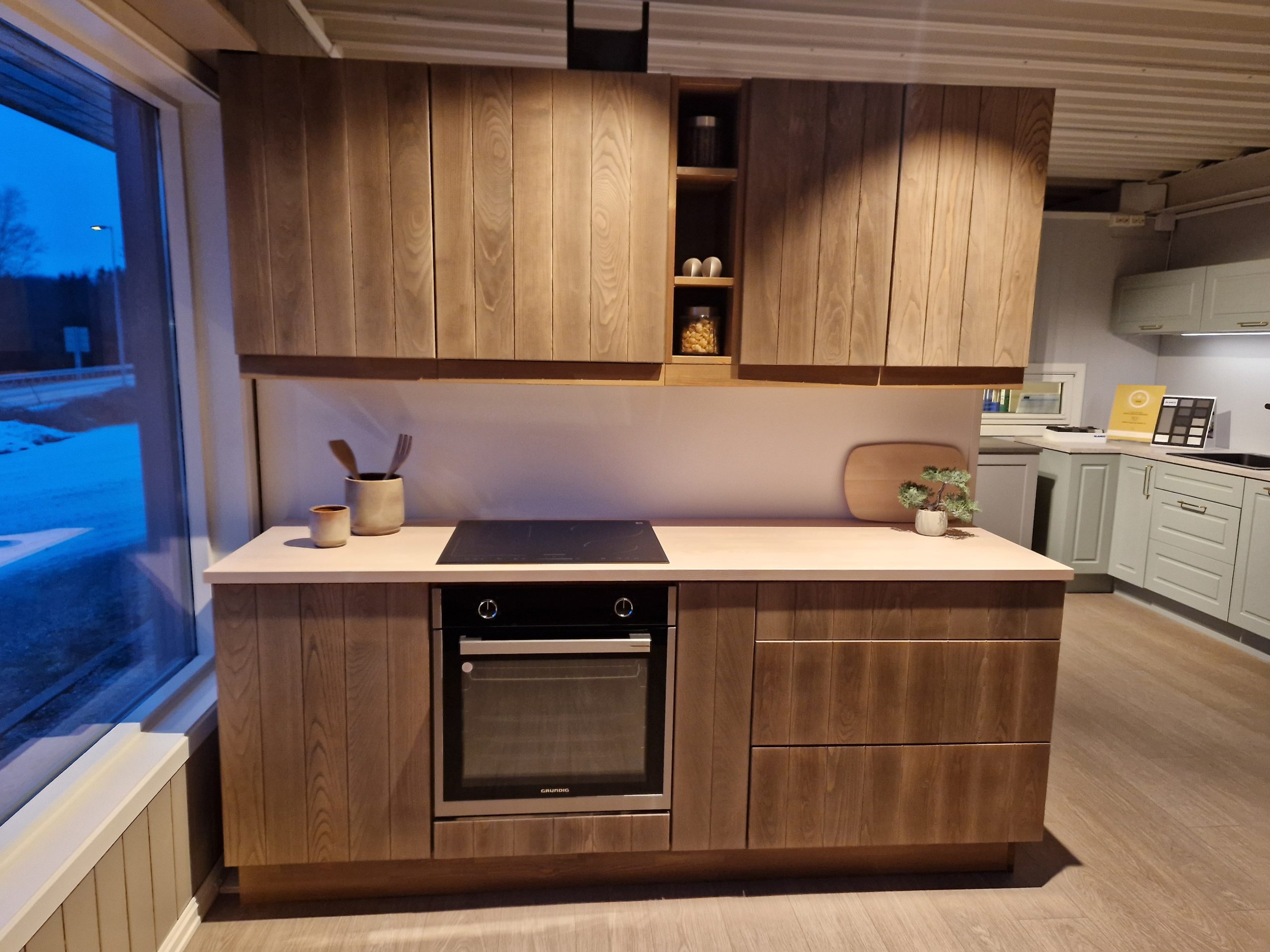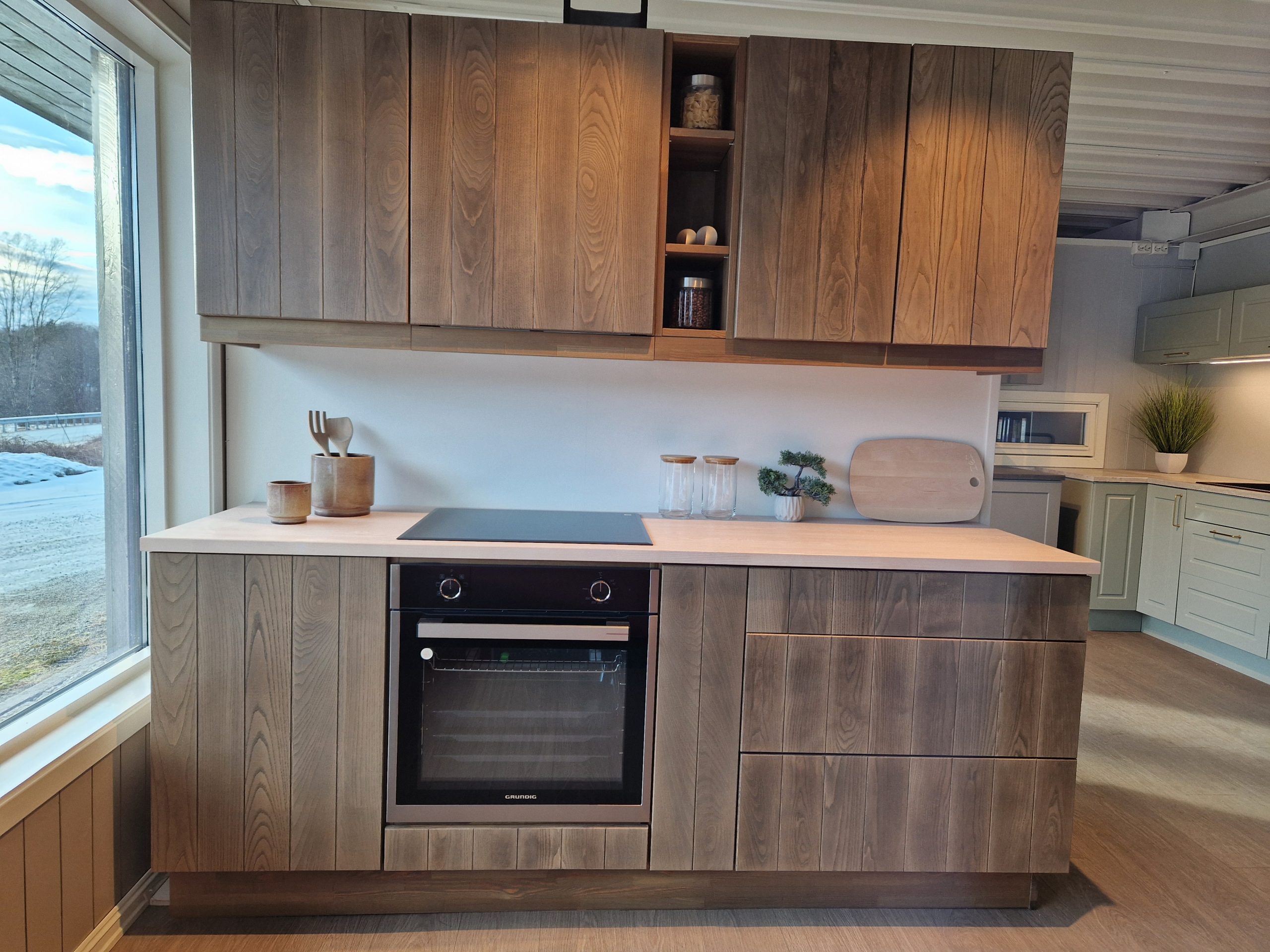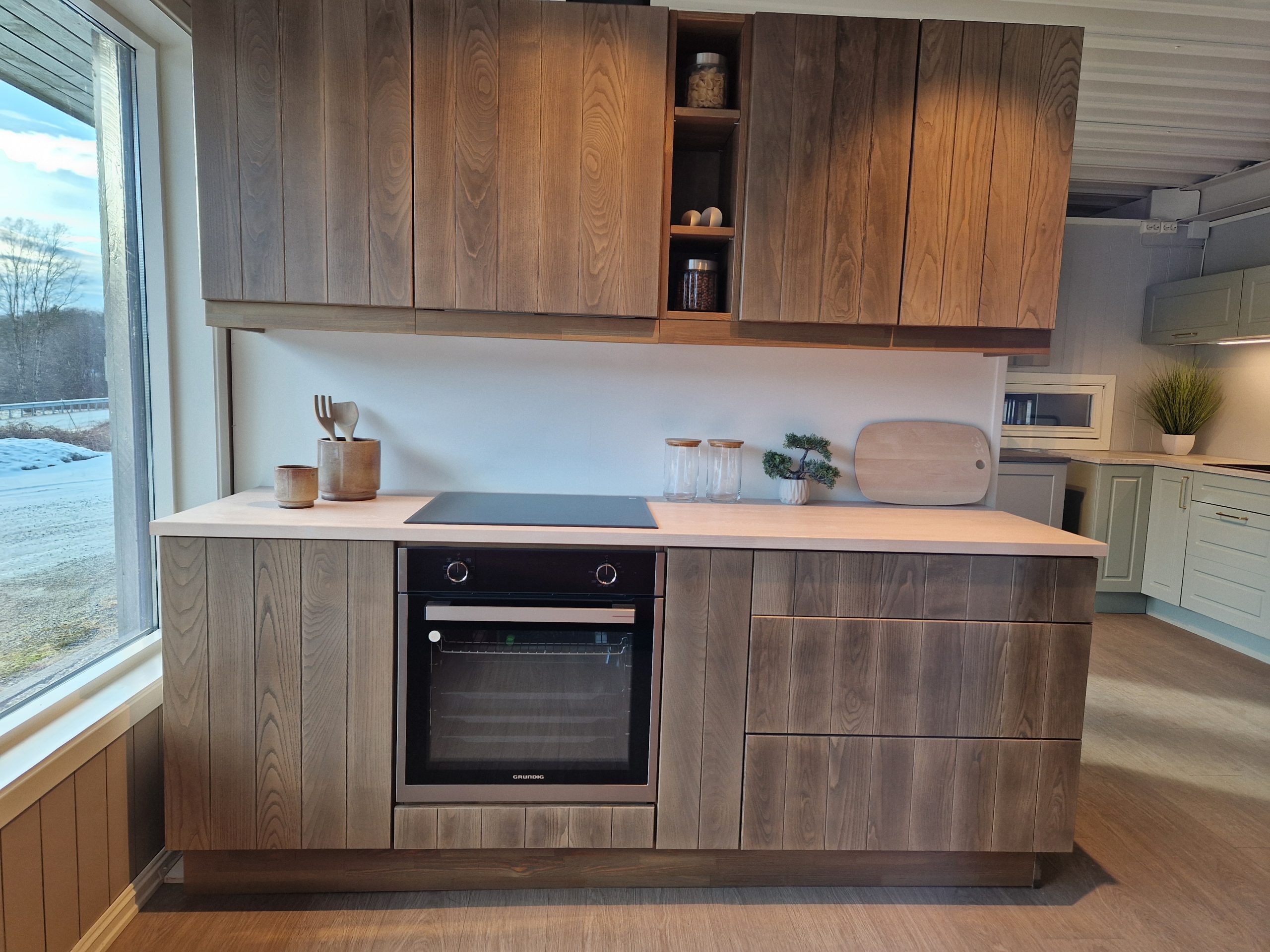 Eit kvalitetskjøkken med furu skrog og frontar i 3 lags ASK. Her vist med vertikale profiler beisa i fargen drivved.