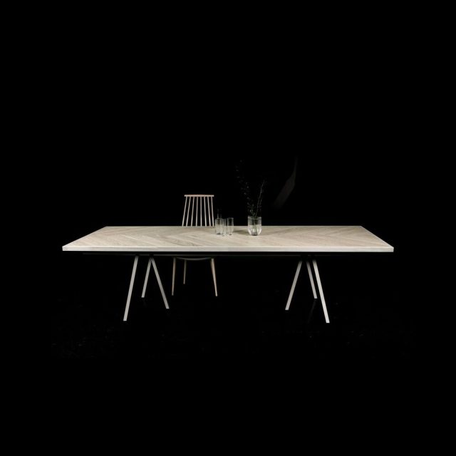Caroline Table er ei nydelig bordplate i fiskebeinsmønster. Borplata er laga av kvit lakka matt eike parkett i nordisk stil.